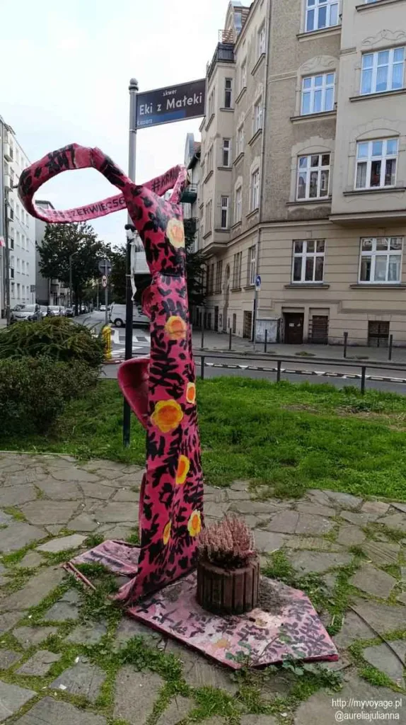 Na skwerze stanął też pomnik upamiętniający wydarzenia z Czerwca 56 – Krawatto. Pomnik z wyglądu przypomina olbrzymi różowy krawat pomalowany w motywy rośline.